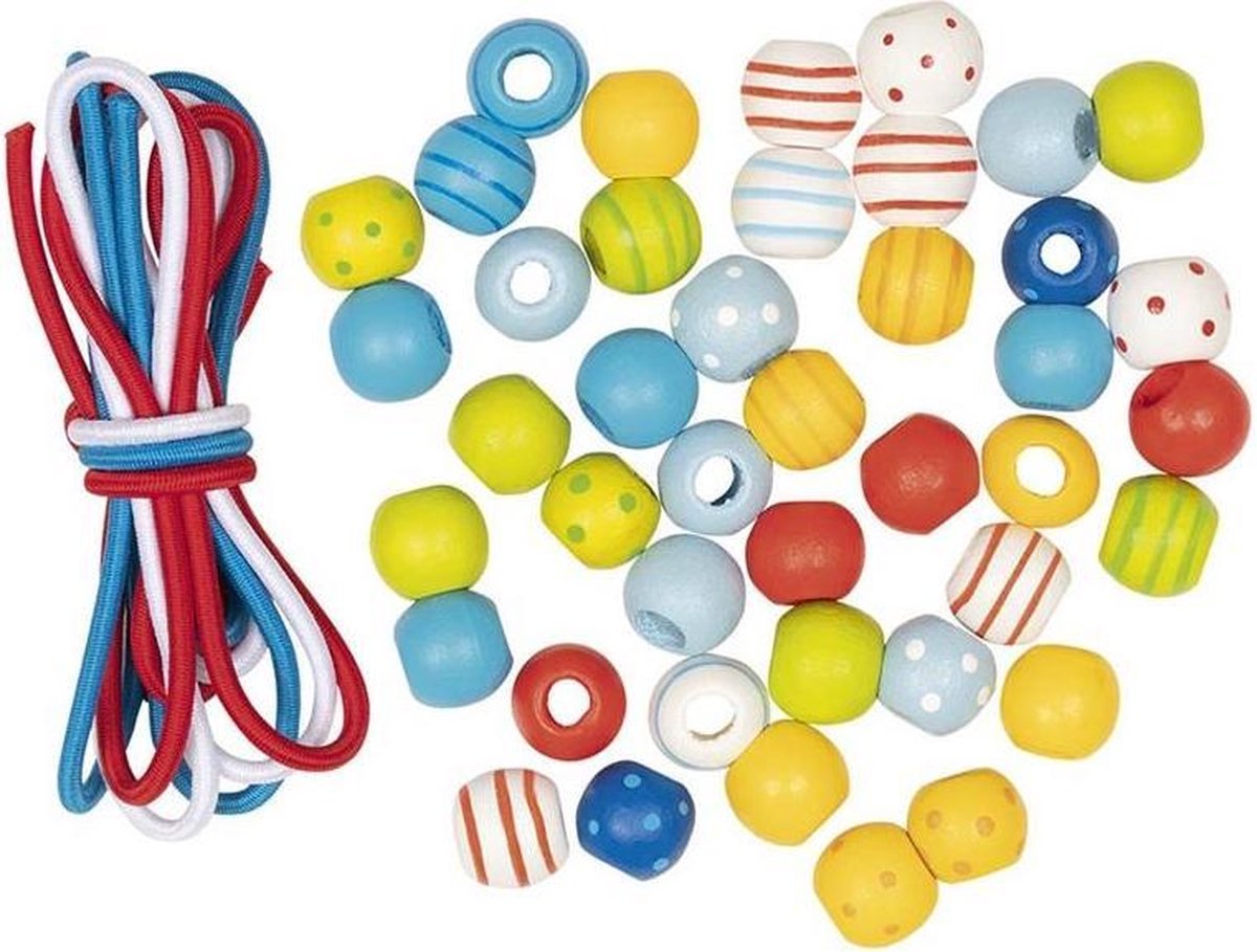 Goki ketting kralenset Maak je eigen ketting met deze set van Goki. De set bevat drie verschillende kleuren touwtjes en 42 kralen. Iedereen zal jaloers worden op je zelf gemaakte ketting! Specificaties: Kleur: multicolor Geslacht: junior Materiaal: hout, textiel Diameter kralen: 1 cm Leeftijd: vanaf 4 jaar Inhoud: 3 Touwtjes 42 Kralen