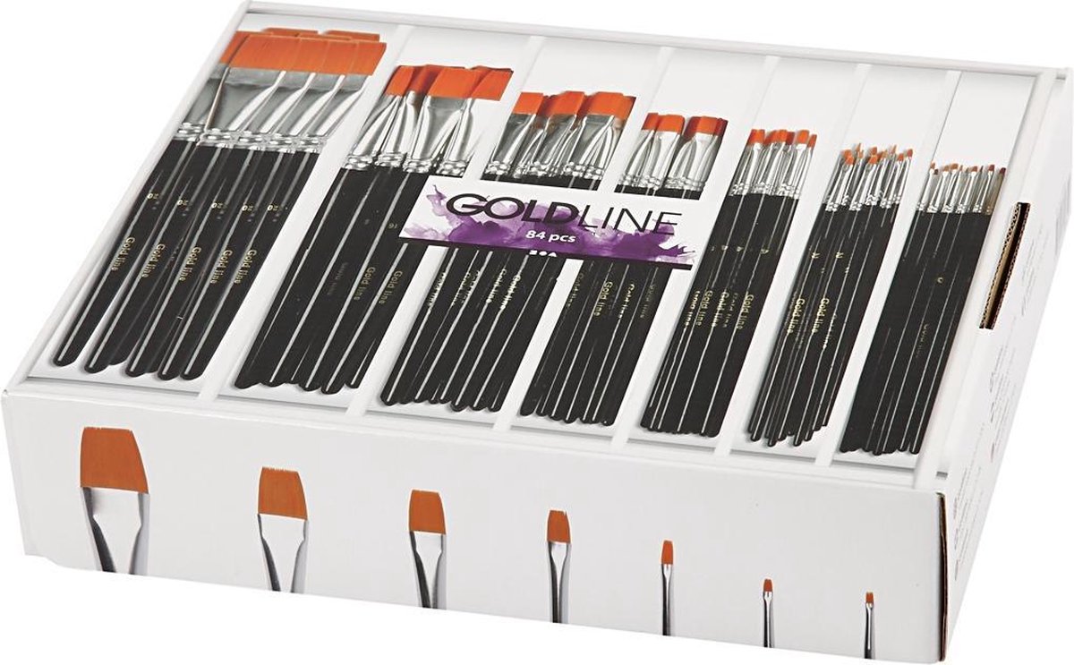 Gold Line penselen (84 div) Excellente ronde all-round penselen met nylon synthetisch haar en korte houten steel. Geschikt voor zowel dunne als dikke verven. Pakket bevat 7 verschillende maten, van elk 12 stuks. Geleverd in een opslagdoos.