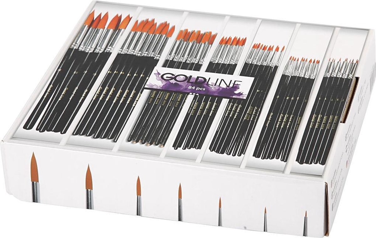 Gold Line penselen (84 div) Excellente ronde all-round penselen met nylon synthetisch haar en korte houten steel. Geschikt voor zowel dunne als dikke verven. Pakket bevat 7 verschillende maten, van elk 12 stuks. Geleverd in een opslagdoos.