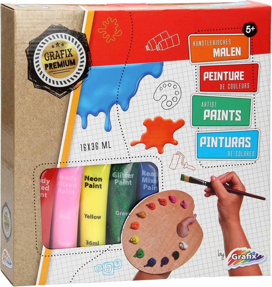 Deze prachtige verf-set bestaat uit 16 tubes van 36 ml: -Zilver en goud -glitter rood,groen en paars -neon groen, geel en roze -basis wit, zwart, geel, groen, paars, roze, rood, blauw