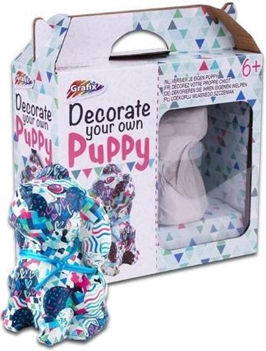 Grafix decoreer je eigen puppy Decoreer jouw puppy helemaal naar jouw eigen smaak met deze leuke set! In de set zitten allerlei spullen om jouw creativiteit op los te laten. Specificaties: Kleur: blauw Geslacht: meisjes Materiaal kunststof Leeftijd: vanaf 6 jaar