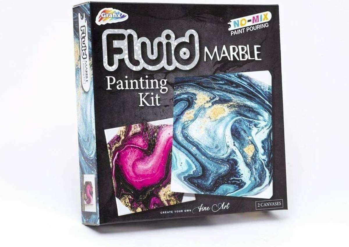 Grafix Fluid Marble Painting Glitter Craft Creative Childrens Hobby Kit In een notendop: ideaal als cadeau voor kleine ambachtsliefhebbers, deze kit maakt het mogelijk unieke marmerafdrukken op water te maken en helpt de verbeeldingskracht en creativiteit te ontwikkelen. Productdetails: maakt het mogelijk om unieke prints op water te maken. Kan helpen bij het ontwikkelen van creativiteit en verbeeldingskracht? Set bevat: acrylverf 30 ml - turkoois, acrylverf 30 ml - zwart, acrylverf 30 ml - roze, acrylverf 50 ml - wit, vijf papieren bekers, PVA-lijm 240 ml, siliconenolie 10 ml, 2x houten roerstokjes, 2x vierkante doeken - 15 cm x 15 cm, 1x gouden glitterpakket, instructies Makkelijk te gebruiken Afmetingen doos: 25 cm (H) x 30 cm (B) x 6 cm (D)