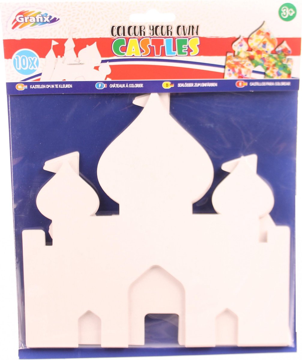 Grafix kleur je eigen kasteel Laat je creativiteit erop los en gebruik je rijke fantasie met het inkleuren van deze kastelen van Grafix. Specificaties: Kleur: wit Geslacht: junior Materiaal: papier Leeftijd: vanaf 3 jaar Inhoud: 10 Vellen