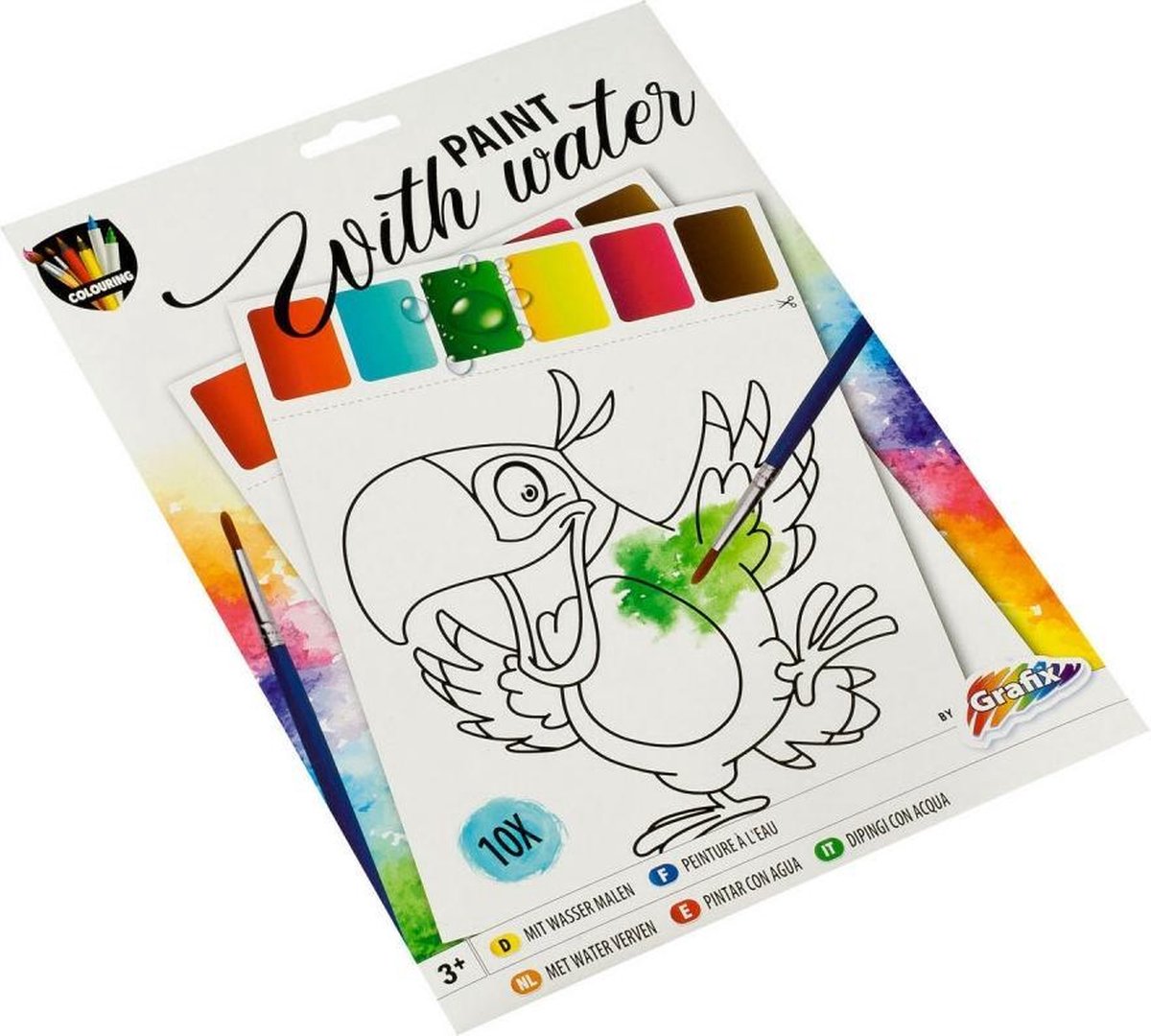 In de waterverf set van Grafix zitten 10 verschillende vellen met elk een andere afbeelding. Op ieder vel zitten zes kleuren verf. Zodra je over deze kleuren heen gaat met een natte penseel, kun je deze gebruiken. Het enige wat je nodig hebt is een penseel en een glas water