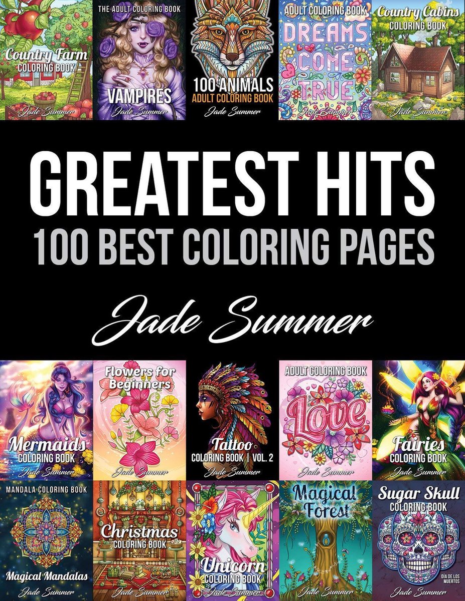 An Adult Coloring Book / kleurboek voor volwassenen with 100 Best Pages from the Jade Summer Collection. 100 Coloring Pagesfrom 100 different Jade Summer books. ISBN 9781695635791, Engels, eenzijdig bedrukt, zwarte achterzijde bladzijden, 203 pagina's. Afmeting: 21,6 x 1,2 x 27,9 cm, 400 gram, 1 oktober 2019 Discover the 100 Best Coloring Pages from the Jade Summer Collection Our Greatest Hits (2019) is the ultimate coloring book and a must-have for anyone who loves to color! We have included our favorite 100 coloring pages from 100 different Jade Summer books. We have included a tremendous variety of images, so everyone from beginners to experienced colorists will have plenty to enjoy. This unbelievable collection includes something for everyone to love. You get to color many different themes, including animals, flowers, landscapes, mandalas, patterns, fantasy, holidays, inspirational, and many more! We want everyone from aspiring artists to passionate colorists to experience the