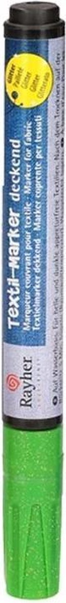 Groene glitter textielstift, dekkend. Stift met een dikke punt om op kleding (textiel) te schrijven zonder te fixeren! Schrijven, laten drogen en klaar om te dragen. De stift is watervast dus het textiel kan in de wasmachine.