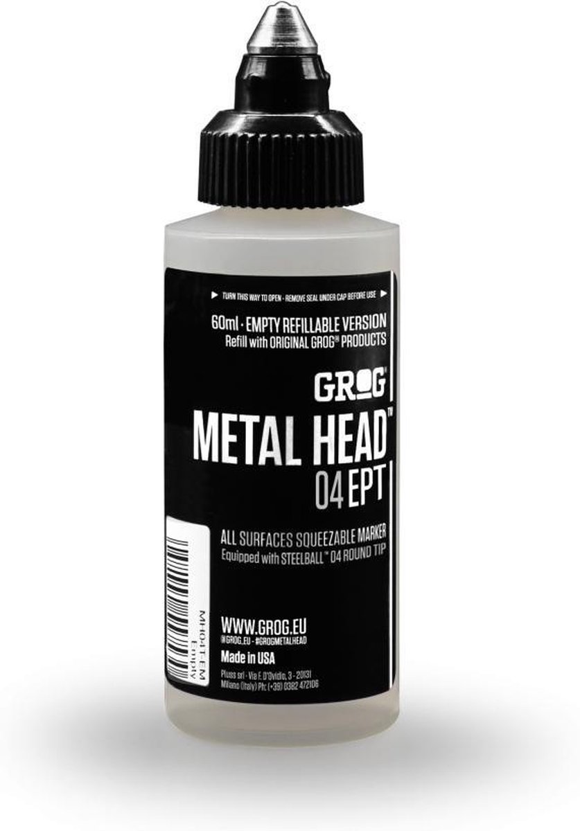 Lege versie van de Grog Metal Head marker. De lege Grog markers kunnen worden gevuld met de verfkleuren die je zelf wilt, of je kan zelfs meerdere kleuren verf mengen. Met zijn 60 ml vatvolume kan METAL HEAD 04 EPT worden gevuld met de RUFF STUFF PAINT 120-navulling, met FULL METAL PAINT-navulling, wanneer een lang druppeleffect gewenst is.