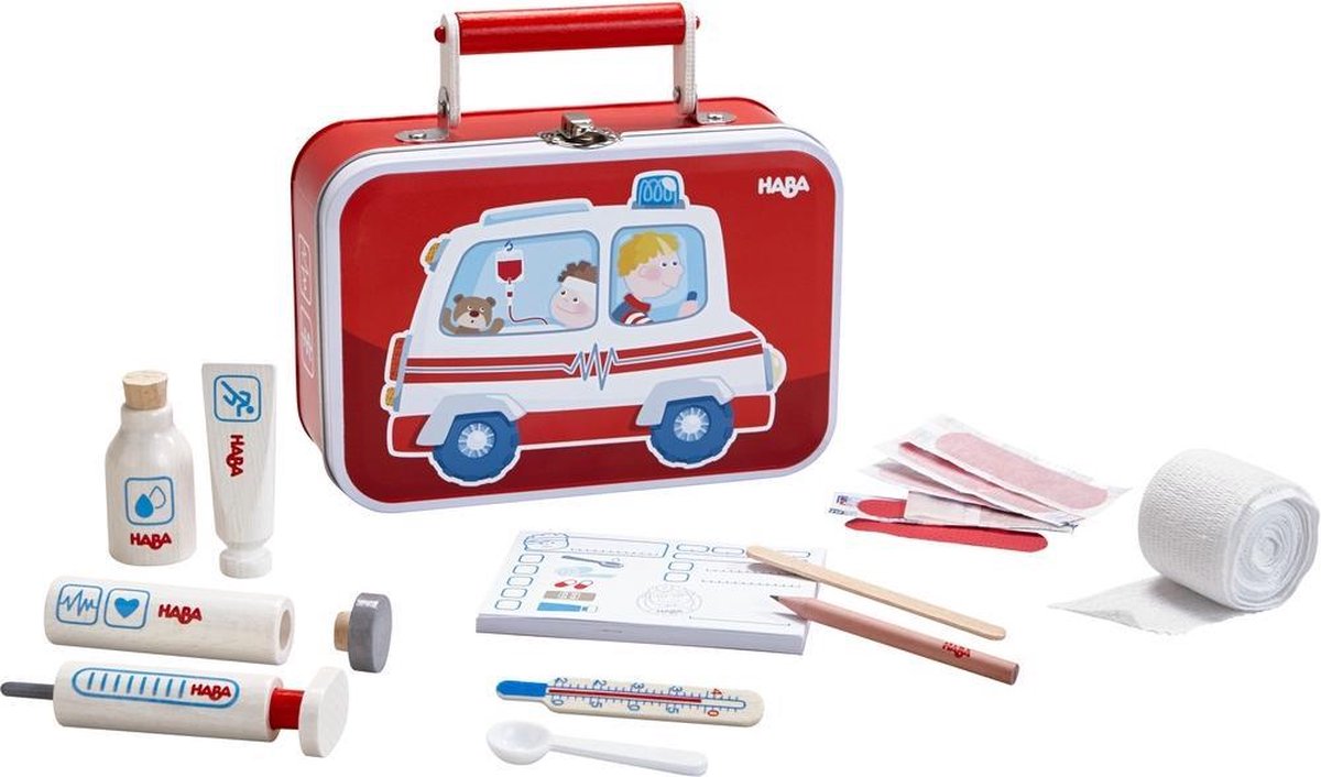 Wanneer de lievelingspop koorts heeft of de teddybeer zich aan zijn poot verwond heeft, moet men er snel mee naar de dokter gaan! Gelukkig kan deze ook op huisbezoek komen bij de patiënt. De HABA-dokterstas bevat immers alles wat voor de behandeling nodig is. Inhoud: 1 receptenboekje, 1 potlood, 1 spatel, 1 houten spuit, 1 tube zalf, 1 lepel, 1 koortsthermometer, 4 pleisters, 1 druppelflesje, 1 elastisch verband, 1 buisje tabletten. Waarschuwingen: Waarschuwing. Niet geschikt voor kinderen jonger dan 3 jaar. Kleine onderdelen. Verstikkingsgevaar. Gewicht product: 0,013 kg Hoogte: 6,5 cm Breedte: 14,5 cm Lengte: 19 cm Leeftijd vanaf: 3 jaren Materiaal: Metaal, Papier, Hout