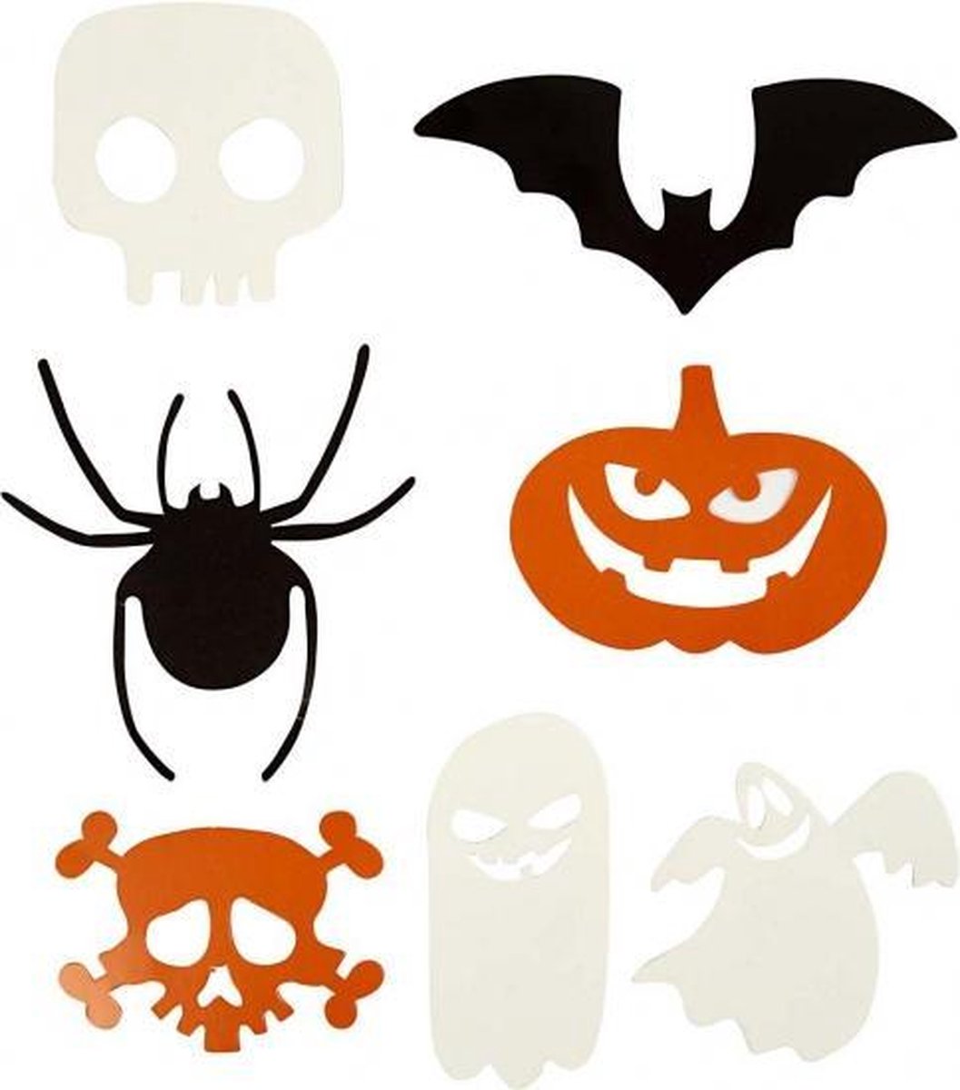 7 verschillende Halloween figuren uitgestanst uit karton. Verschillende afmetingen: tussen 5 en 10 cm, 180 grams. 50 stuks.