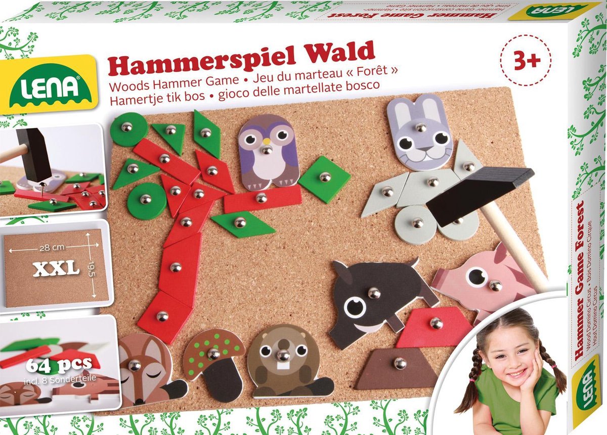Hamertje Tik Bos Om kleurrijke motieven te creëren volgens voorbeelden of gebruik je eigen fantasie. Bevordert de creativiteit en motoriek. Bevat: - 64 gekleurde houtvormen - Hamer - Spijkers - Zachtboard plaat: 28 x 19,5 cm.