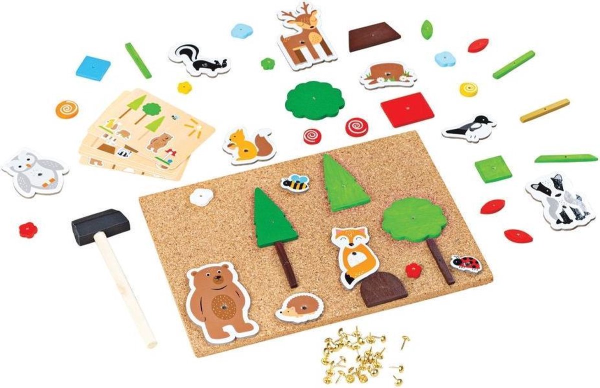 Al generaties lang een favoriet, Hamertje tik spellen raken nooit uit de mode! Met behulp van de meegeleverde hamer kunnen de vrolijk gekleurde houten vormen worden gecombineerd en met de glimmende spijkertjes op het prikbord worden getimmerd om eindeloos verschillende bosscènes te creëren. Bevat bomen, bosdieren, struiken, insecten en meer. Compleet met hamer en zakje spelden. Ideaal voor individuele en interactieve speelsessies die zowel leerzaam als creatief zijn. Moedigt creatief en fantasierijk spel aan. Ontwikkelt hand / oog coördinatie, fijne motoriek, behendigheid en concentratie. Voldoet aan de huidige Europese veiligheidsnormen.