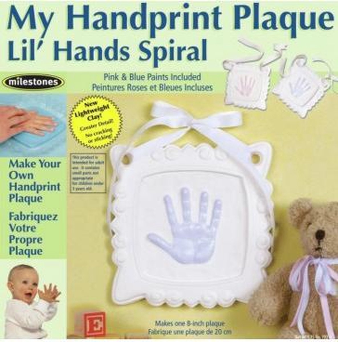Je kleintje blijft niet voor altijd klein. Maak nu een blijvende herinnering door de hand in de klei te duwen. Dit zorgt ervoor dat de kleinste details zichtbaar zijn. Daarna giet u het gips in de mal. Met de bijgeleverde roze of blauwe verf maakt u de afdruk af. Past voor handjes tot ongeveer 5 jaar