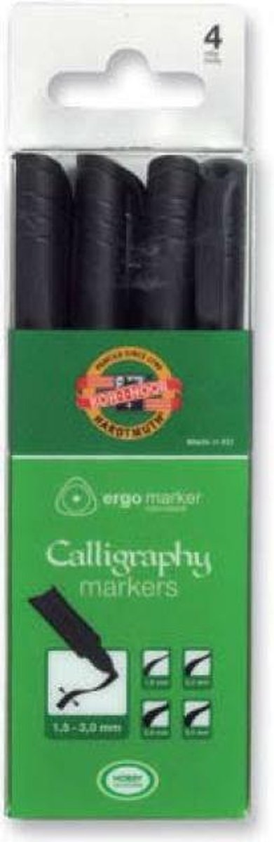 Handlettering-/kalligrafie markers, set met 4 diktes. Deze set bevat markers met een beitelpunt in de volgende diktes: 1,5-2,0-2,5 en 3,0. De meest gangbare maten in een set. De prima kwaliteit markers op waterbasis hebben een ergonomische grip.