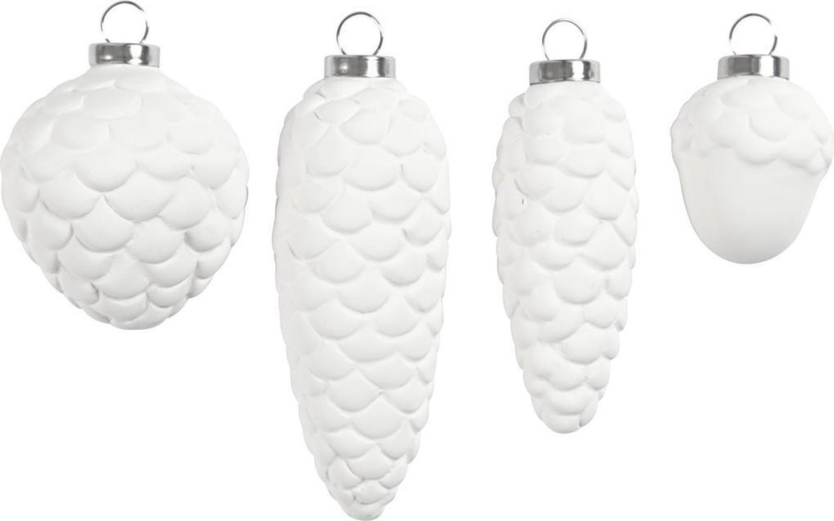 Denneappels en eikels van terracotta met zilverkleurig, metalen ophangoog.Denneappels en eikels van terracotta met zilverkleurig, metalen ophangoog.