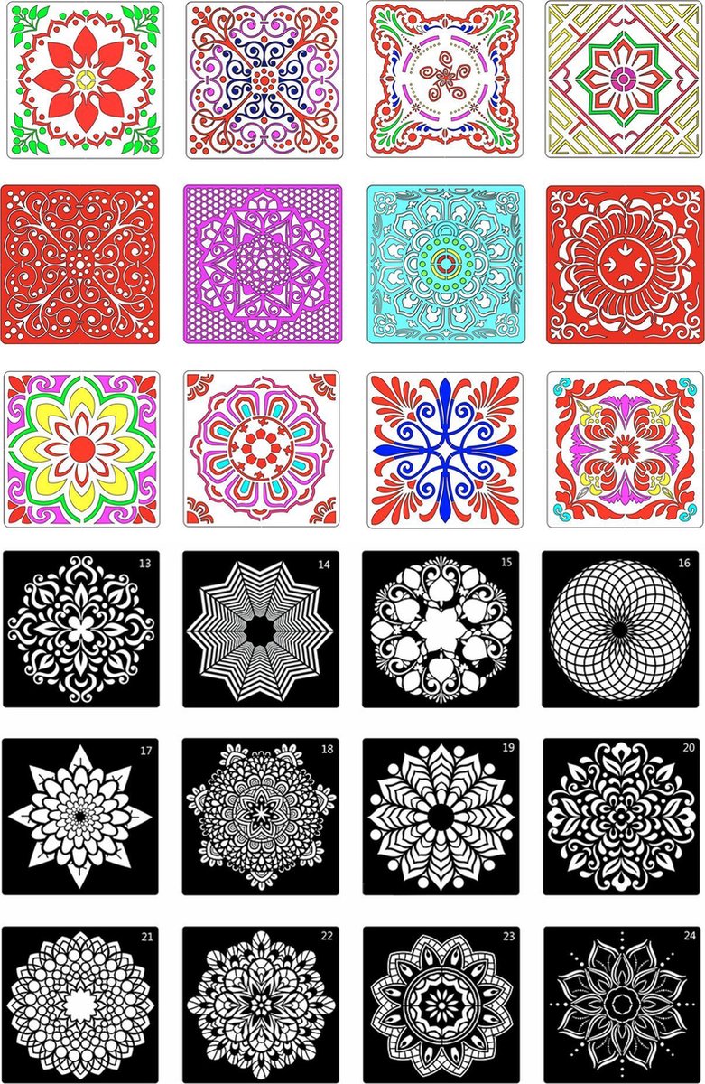 Zoek jij een betekenisvolle creatieve bezigheid? Het maken van een mandala is een leuk creatief proces met zijn wortels in oud-Aziatische spirituele tradities. Door stapsgewijs in cirkels aan te brengen kun je zelf de allermooiste patronen maken. Onze mandala sjabloon zet is zowel geschikt om met het grootste gemak je entrée in de wondere wereld van het mandala dotting te maken of om een creatieve impuls te geven aan een ervarene mandala designer. Het mandala sjabloon set van Happy Goods® bevat verschillende stencils om zelf prachtige creatieve mandala’s te maken met creatieve patroonideeën. Specificaties Happy Goods® mandala sjabloon set: ? 24 Mandala dotting sjablonen (15x15cm) De mooiste designs met een mandalasjabloon! Als kersverse mandala designer moet je natuurlijk ergens inspiratie opdoen om je mooiste creaties te maken. De bijgeleverde mandala sjablonen geven je een veelheid aan creatieve ideeën in veel verschillende stijlen voor het maken van de allermooiste