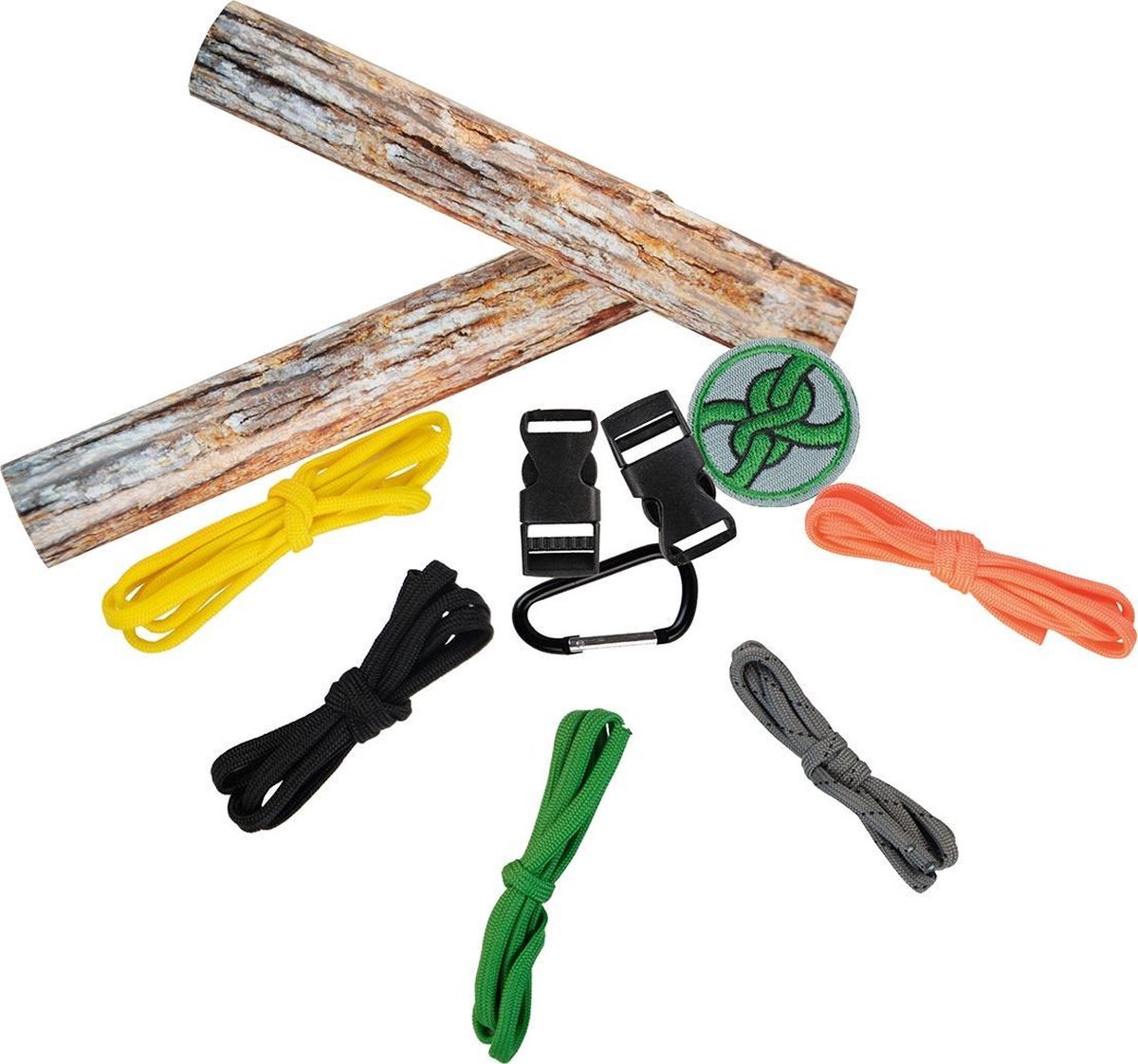 Happy People Scout knoopset Met deze knoopset kun je je kinderen op een leuke manier allerlei verschillende soorten knopen aanleren. De knoopset bevat een boekje met verschillende soorten knopen en hoe ze gelegd moeten worden, dit geeft uren speelplezier. Specificaties: Kleur touw: geel, zwart, groen, grijs, oranje Kleur hout: naturel Kleur badge: grijs, groen Kleur clipjes: zwart Kleur karabijnhaak: zwart, zilver Geslacht: junior Materiaal touw: nylon Materiaal hout: hout Materiaal clipjes: kunststof Materiaal karabijnhaak: aluminium Verschillende knopen: 12 Leeftijd: vanaf 4 jaar Inhoud: 5 Touwen 2 Stukken hout 2 Clips 1 Carabijnhaak 1 Badge 1 Knopenboek