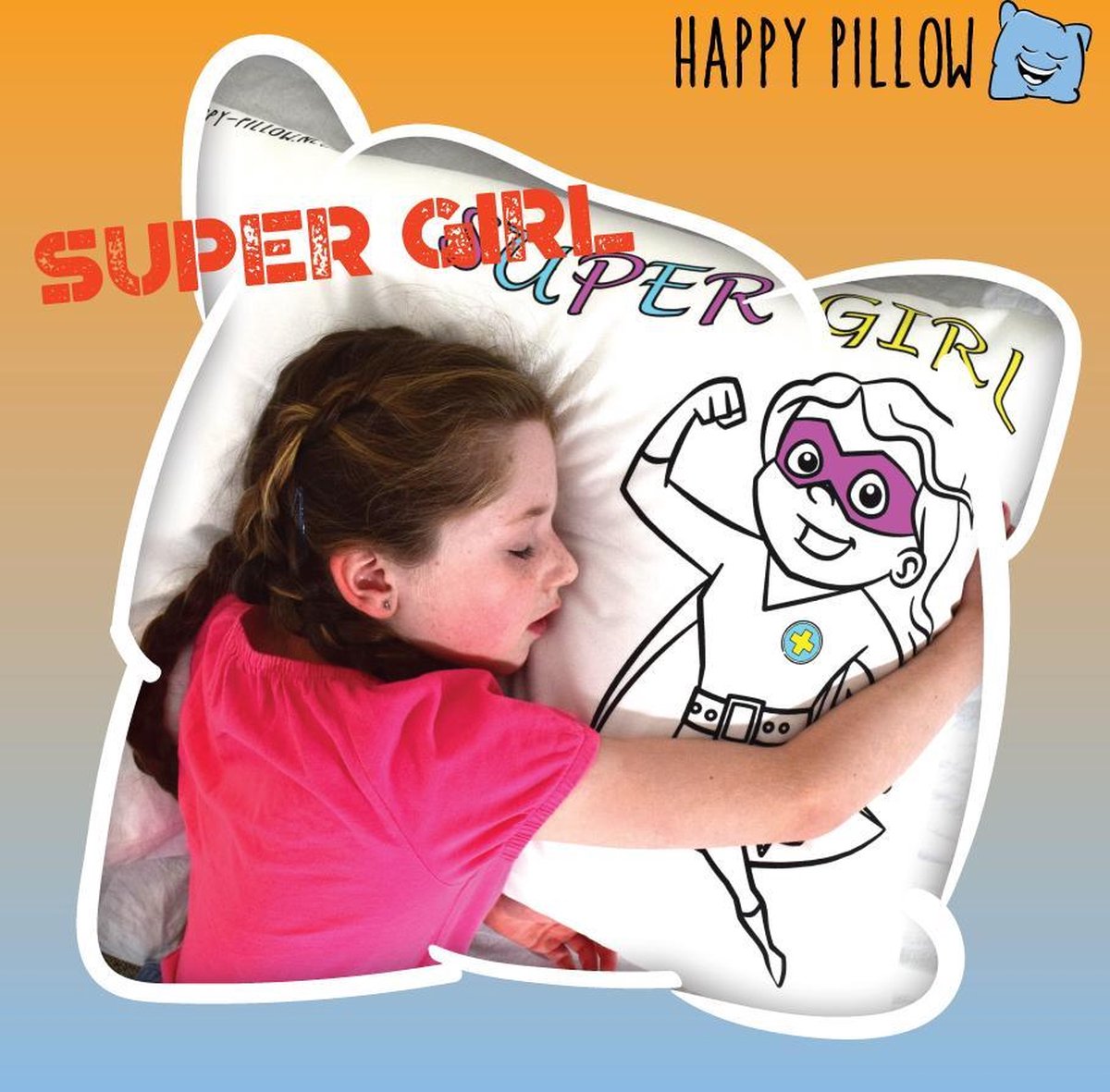 De Supergirl Happy Pillow is bedoeld om jou superblij te maken. Als je blij en vrolijk bent, dan slaap je beter! Je kunt Super Girl ook inkleuren met de 5 bijgeleverde textielstiften (zwart, roze, paars, geel & lichtblauw) Als je klaar bent met kleuren, kun je naast Supergirl, superlekker slapen.