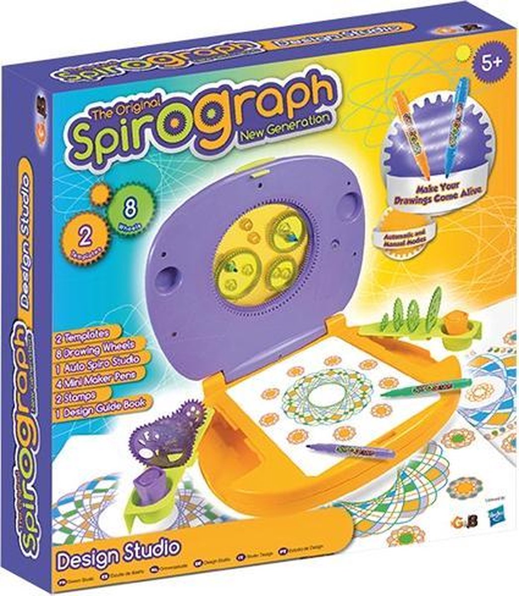 Met Spirograph maak je de mooiste tekeningen met geometrische vormen. Plaats een vorm in de houder, pak je potlood of stift en volg de vormen - er zijnduizenden verschillende creaties mogelijk! Deze Spirograph Studio is eenvoudig mee te nemen: alles wat je nodig hebt zit in de koffer, die ook meteen je tekentafel is. Bij het tekenen kun je kiezen om handmatig een vorm te maken, maar ook automatisch is mogelijk. Zo verschijnt voor je ogen telkens weer een andere schitterende vorm met de Spirograph Studio!Maak je tekening met verschillende kleuren en maak het af met de stempels. De set bestaat uit een Spirograph Studio, 2 frames, 12 vormen, 4 stiften, 2 stempels en 10 vellen papier.