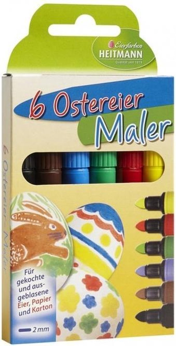 Stiften met pure voedingskleurstof voor het creatief beschilderen van gekookte of uitgeblazen paaseieren. Stiften Geel, Rood, Groen, Blauw, Bruin, Zwart Afmeting stiften: 12x1,3cm