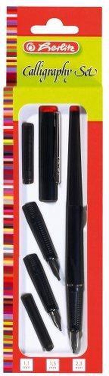 -Herlitz kalligrafiepennen set, 5– delig zwart. -1 kunststof houder voor verschillende penpunten. -3 penpunten met verschillende schrijfbreedtes : 1.1mm, 1.5mm, 2.3mm. -Inclusief 2 inktpatronen in de kleur zwart. -Ideaal schrijfcomfort door de lange houder. -Voor decoratief schrijven. -Pen schuin houden bij het schrijven