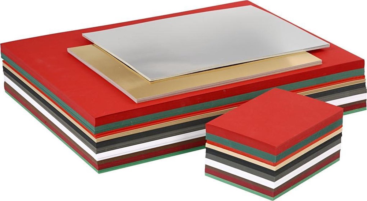 Het traditionele Kerstkoopje (1 sets) Dit pakket bevat verschillend karton in kerstkleuren om mooie en elegante decoraties te maken. Inhoud: 300 vel A3 karton in kerstkleuren, 300 vel A6 karton, 20 vel A4 goudkleurig karton en 10 vel A4 zilverkleurig.
