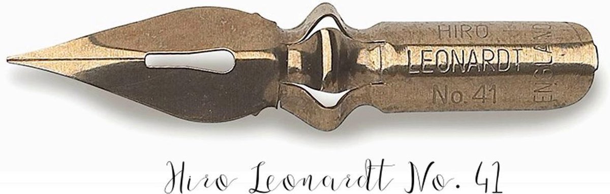 De Hiro Leonardt 41 is een hele flexibele Nib, hi/zij wordt ook regelmatig aangeduid als de kroontjespen. De Nib is van staal gemaakt, en de pen heeft een kroonvormige verbreding vandaar dat deze kalligrafiepen aan zijn naam komt. Dé Nib voor Moderne Kalligrafie. + een Handig Vintage Bewaardoosje. + A4 Sample Archie.s Kalligrafeer Papier.