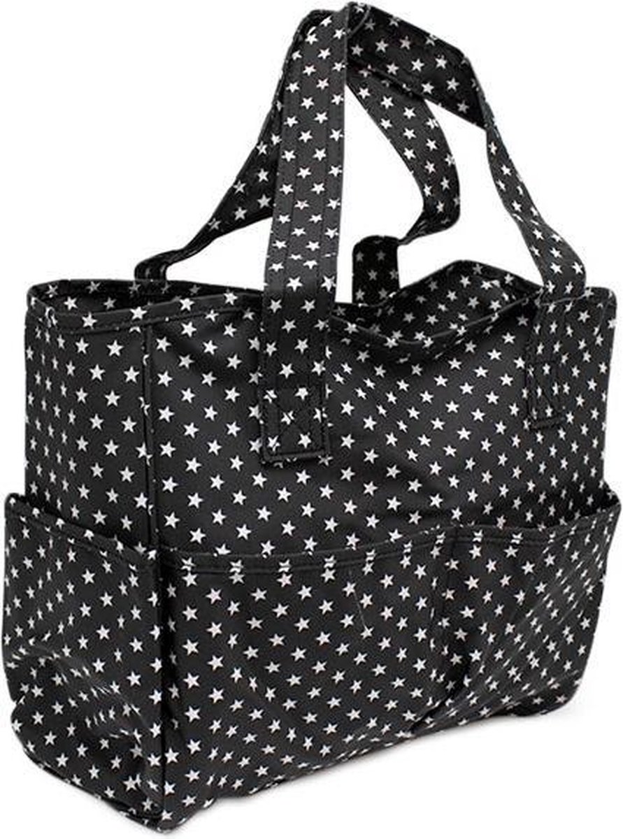 Hobbytas Black Star - Dat praktisch niet per definitie saai is, bewijst deze toffe hobbytas. De tas heeft een stoere zwarte kleur, met witte sterrenprint. Het grote binnenvak biedt genoeg ruimte voor garens, boeken en naalden. Bovendien is dit vak afsluitbaar met een rits. Ook aan de buitenzijde zitten nog enkele vakken, waar je wat kleinere accessoires in kunt opbergen. De tas is gemaakt van stevig katoen met een PVC coating. Afmeting 36.5 x 14 x 30 cm.