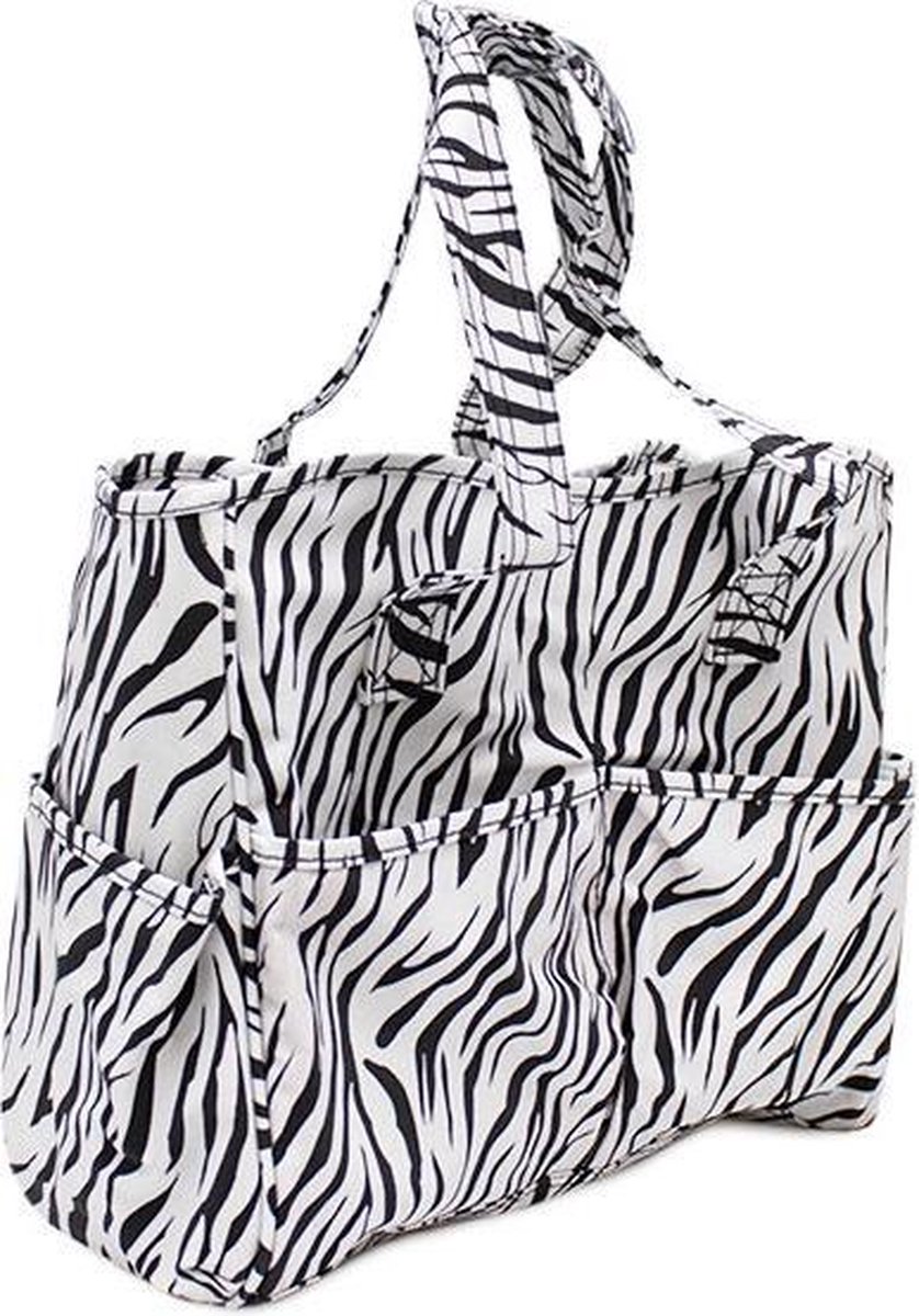 Hobbytas Zebra – Bij Wolplein vind je heel veel hobbytassen in diverse, trendy printjes. Zoals deze brei- of haaktas met zebraprint. In deze tas neem je jouw brei- of haakwerk en alle benodigdheden als garens en naalden gemakkelijk mee op stap. Wanneer je bijvoorbeeld op vakantie gaat of wil genieten van het zonnetje in het park. De tas heeft een ruim hoofdvak, dat afsluitbaar is met een rits. Aan de buitenzijde van de tas zitten nog enkele steekvakken, waar je ook nog wat hobbyspullen geordend in kunt opbergen. Deze hobbytas is gemaakt van stevig katoen en heeft een PVC coating. Afmeting 36.5 x 14 x 30 cm.