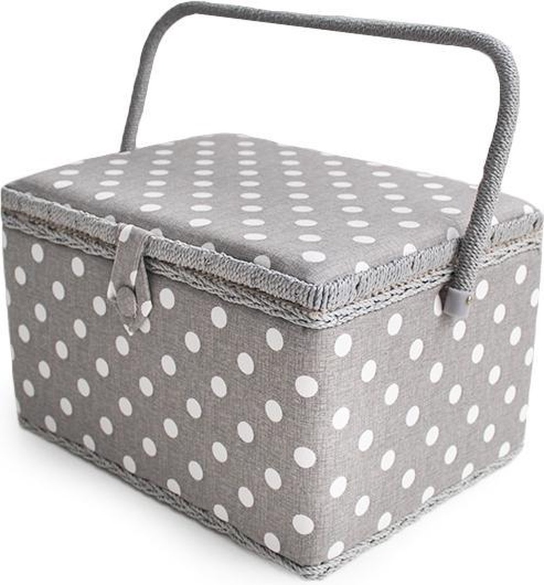 Naaimand Grey Linen Polka Dot Large - Deze naaimand met vrolijke stippen is een perfecte aanvulling op je hobbyspullen. Het uitneembare kunststof opbergplateau biedt ruimte voor de kleine fournituren, in de bak daaronder is kun je je bolletjes wol en garen kwijt.