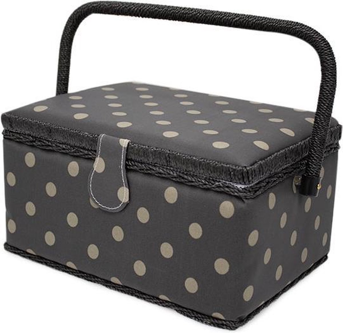 Naaimand Medium Charcoal Spot – Een hippe, blauwgrijze naaimand met tijdloze polka dots voor het opbergen van al je handwerkaccessoires en fournituren. De uitneembare kunststof tray heeft verschillende vakken, zodat jouw spullen fijn geordend blijven. In de ruimte daaronder kun je natuurlijk je wol, garens en andere accessoires kwijt. De deksel van de naaimand heeft een extra opbergzakje met elastische band en mini speldenkussen. Afmeting: 26 x 19 x 14.5 cm.
