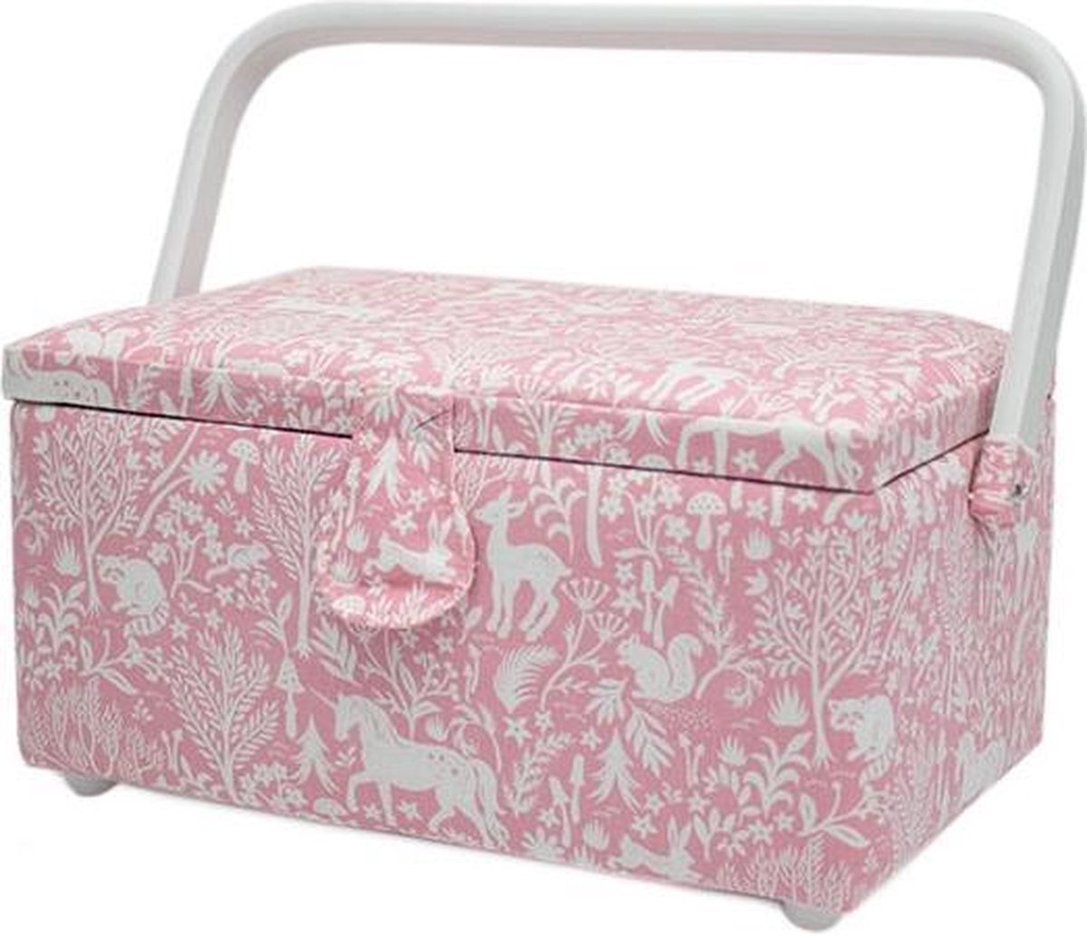 Naaimand Medium Forest Frolic – Dat praktisch niet saai hoeft te zijn, bewijst deze naaimand. Met zijn oudroze kleurtje en print van dartelende bosdieren is deze naaimand een lust voor het oog. De naaimand is zo ontworpen dat je al je handwerkspullen er gemakkelijk en overzichtelijk in kunt opbergen. Garens, naalden, meetlinten en andere fournituren; overal is een handig vakje voor. De naaikoffer heeft een magnetische sluiting, kunststof handvat, speldenkussen aan de binnenzijde van de deksel en een uitneembare tray met diverse vakjes. Afmeting: 25 x 18 x 13 cm.