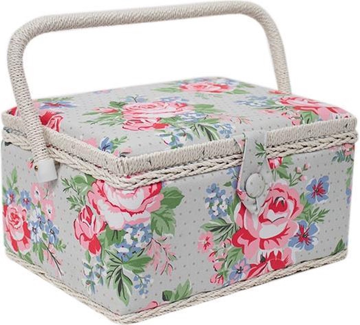 Naaimand Rose Medium - Een vrolijke lichtgrijze naaimand met rozen print voor het opbergen van de hobbyspullen en fournituren. De Naaimand Rose Medium heeft een groot vak voor het opbergen van wol, garens en toebehoren en een plastic tray voor kleinere spulletjes zoals naalden, spelden en accessoires. Het deksel sluit met een magnetische sluiting en heeft een mini speldenkussentje en opbergvakje met elastiek aan de binnenkant. Met het stevige hengsel kun je de naaimand gemakkelijk met je meenemen.