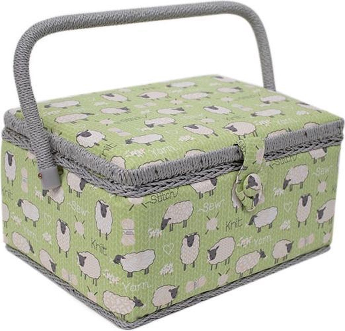 Naaimand Sheep Medium - Een leuke lichtgroene naaimand met witte schapen voor het opbergen van je hobbypullen en fournituren. De naaimand heeft een plastic tray voor het opbergen van kleine accessoires als naalden en fournituren en daaronder een groter vak voor wol, garens en ander toebehoren. De deksel van de naaimand heeft een mini speldenkussen en een handig zakje met elastiek. Een must-have item voor in jouw hobbykamer!
