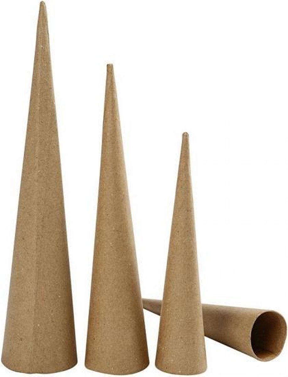 Hobby kegels van papier mache 6 stuks. Assortiment van 6 ronde hoge kegels in verschillende formaten. Formaten: ongeveer h:20-25-60 cm d: 4-5-6 cm. te gebruiken bij knutselen. Hobby/knutselmateriaal.