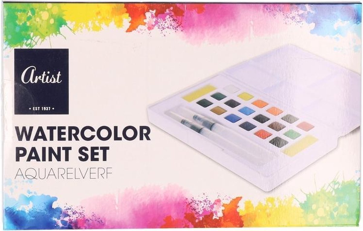 18 Verschillende kleuren waterverf/aquarelverf, in een handig meeneem koffertje. De waterverf set wordt geleverd met een waterpenseel. Dit penseel heeft een reservoir waar u water in kunt doen, dit houdt het kwastje vochtig waardoor u overal kunt schilderen. De deksel van het koffertje heeft een raster, waardoor deze kan worden gebruikt als palet. De verf is op waterbasis, dus verwijderbaar van kleding en handen. Afmeting koffertje: 18 x 11 x 3 cm. Materiaal: kunststof. Hobby/knutselmateriaal - Schilderbenodigdheden - Schilderen met waterverf/aquarel, geschikt voor kinderen/volwassenen.