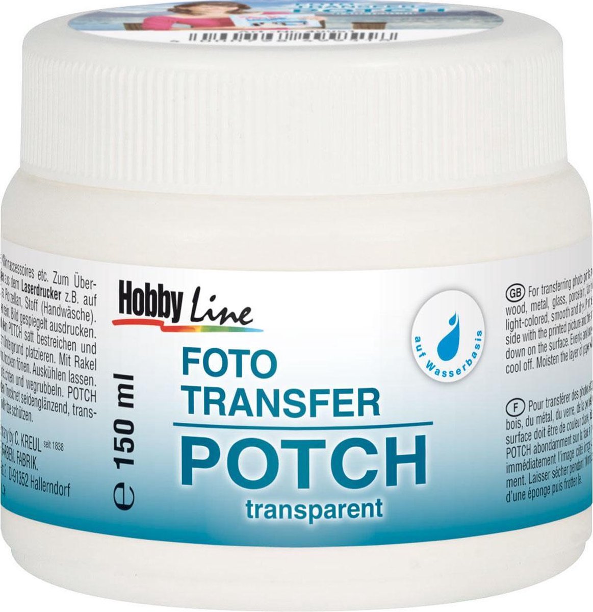Foto Tranfer Potch is een watergedragen transferlijm, De tranferlijm droogt satijn glanzend, transparant en waterdicht kwaliteiten op voor het overbrengen van foto afdrukken en kopieën uit de laserprinter. De ondergrond moeten schoon, glad en droog zijn. Instructies: – Print afbeelding gespiegeld af – Lijmondergrond met de Potch en leg de afbeelding in de lijm – Druk met een een spatel de lucht onder de afbeelding weg – Laat dan 24 uur drogen – Bevochtigd papier laag met een spons en wrijf ze af Toepassingen: – Voor het overbrengen van fotoprints en kopieën van de laserprinter, krantenknipsels en tijdschriftafbeeldingen op hout, keramiek, metaal, glas, porselein of weefsel (handwas) – voor individuele fotogeschenken, woonaccessoires, het ontwerpen van collages door het combineren van foto met acrylverf en stenciltechniek