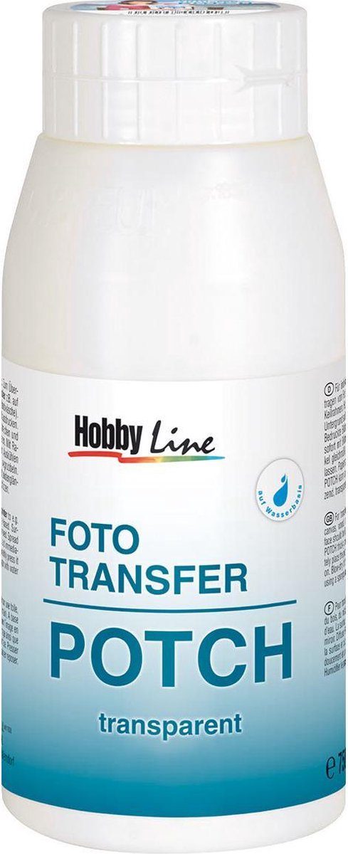Foto Tranfer Potch is een watergedragen transferlijm, De tranferlijm droogt satijn glanzend, transparant en waterdicht kwaliteiten op voor het overbrengen van foto afdrukken en kopieën uit de laserprinter. De ondergrond moeten schoon, glad en droog zijn. Instructies: - Print afbeelding gespiegeld af - Lijmondergrond met de Potch en leg de afbeelding in de lijm - Druk met een een spatel de lucht onder de afbeelding weg - Laat dan 24 uur drogen - Bevochtigd papier laag met een spons en wrijf ze af Toepassingen: - Voor het overbrengen van fotoprints en kopieën van de laserprinter, krantenknipsels en tijdschriftafbeeldingen op hout, keramiek, metaal, glas, porselein of weefsel (handwas) - voor individuele fotogeschenken, woonaccessoires, het ontwerpen van collages door het combineren van foto met acrylverf en stenciltechniek
