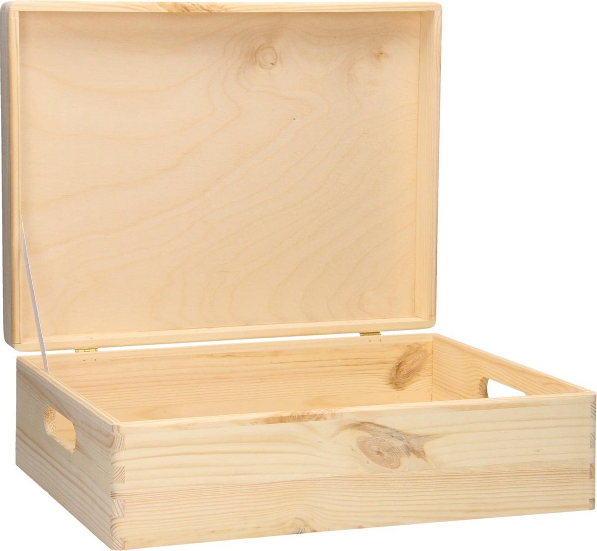 Grenen opbergkist met klepdeksel die met behulp van een lint aan de linkerzijde open kan staan. Kan worden gedecoreerd met acrylverf of Foam Clay en meer