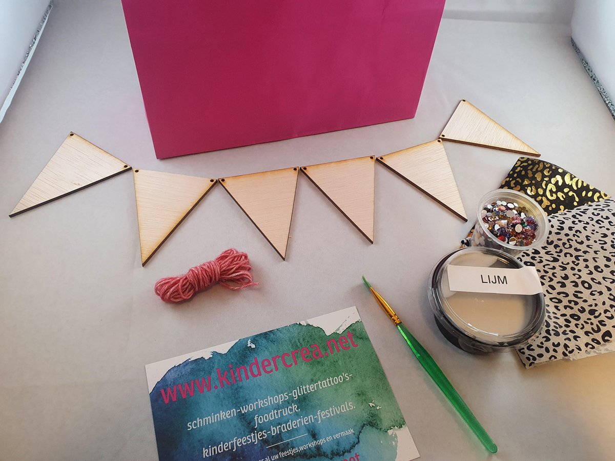 maak je eigen vlaggenlijn leuk voor aan de deur of op een kinderkamer. Met dit leuke knutselpakket heb je gegarandeerd een leuke knutselactiviteit, met het stappenplan word je op gang geholpen om je eigen kunstwerk te maken. in dit complete pakket zit lijm, versieringen, stof en een handleiding . uiteraard de leuke houten vlaggetjes