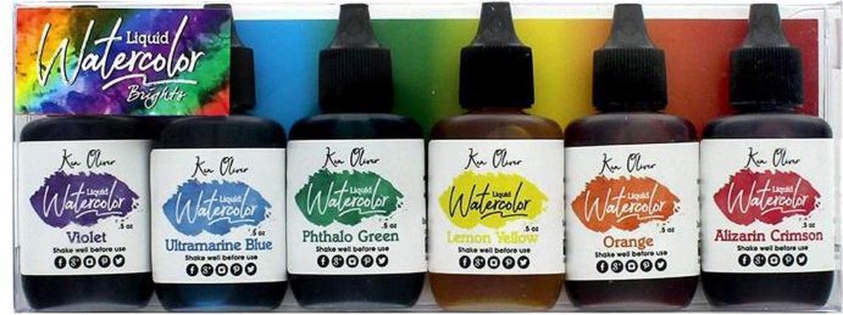 Het pakket bevat 6 flesjes van 15ml met gepigmenteerde verf die dezelfde intensiteit heeft als aquarelverf. Het kan onverdund worden gebruikt voor intense kleuren of verdund worden voor lichtere kleuren. De kleuren zijn: Violet Ultramarine Blue Phthalo Green Lemon Yellow Orange Alizarin Crimson
