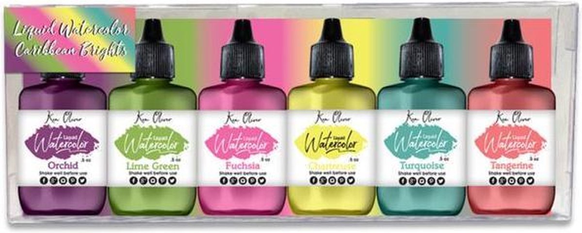 Het pakket bevat 6 flesjes van 15ml met gepigmenteerde verf die dezelfde intensiteit heeft als aquarelverf. Het kan onverdund worden gebruikt voor intense kleuren of verdund worden voor lichtere kleuren. De kleuren zijn: Orchid Fuchsia Lime green Chartreuse Turquoise Tangerine