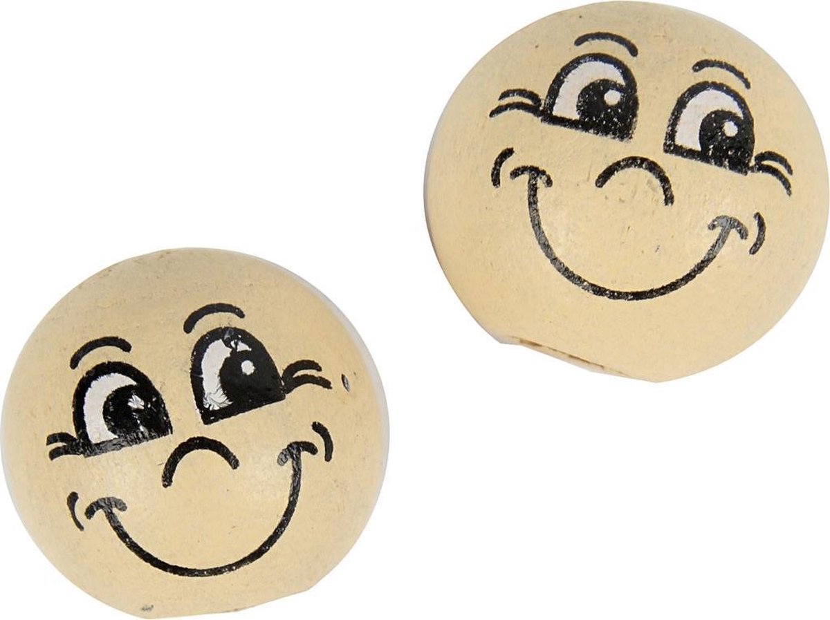 Half doorboorde, beige houten ballen met grappig gezicht.