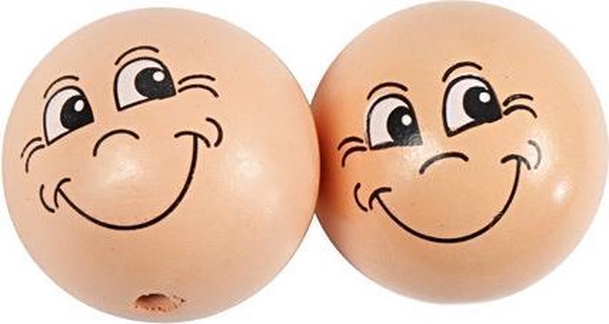 Half doorboorde, beige houten ballen met grappig gezicht.