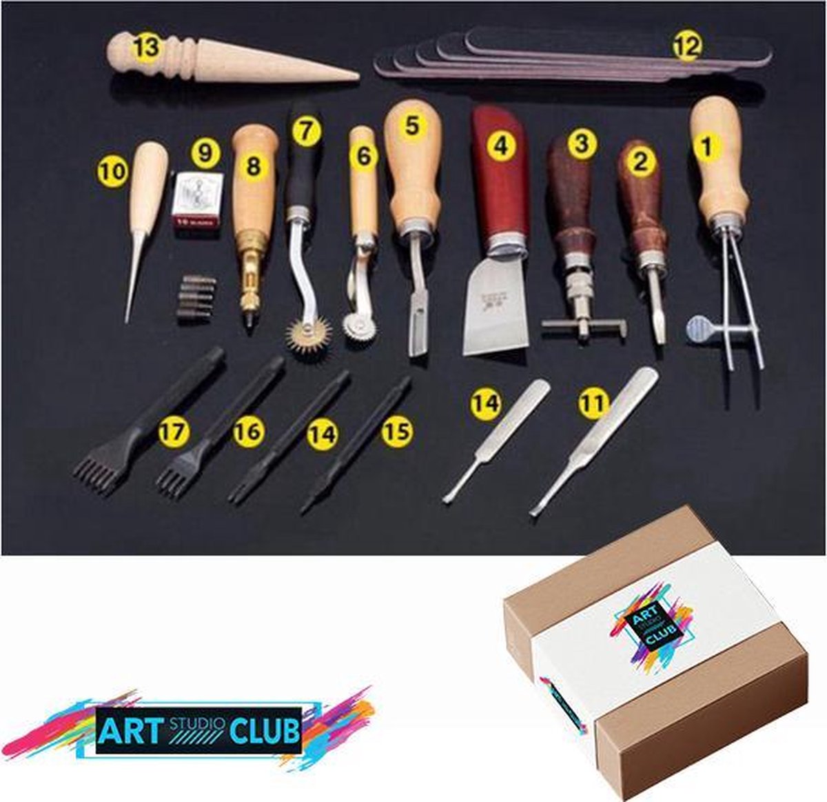 Geweldig voor amateurs en gevorderde ambachtslieden. -Deze lederen set bevat 17 verschillende gereedschappen, noodzakelijk voor elke leervakman, en 10 messen. -Onder de gereedschappen zijn Priem, polijstgereedschap, scheermes, perforator en beitel. -Zie foto's voor volledige details van de ingestelde inhoud.