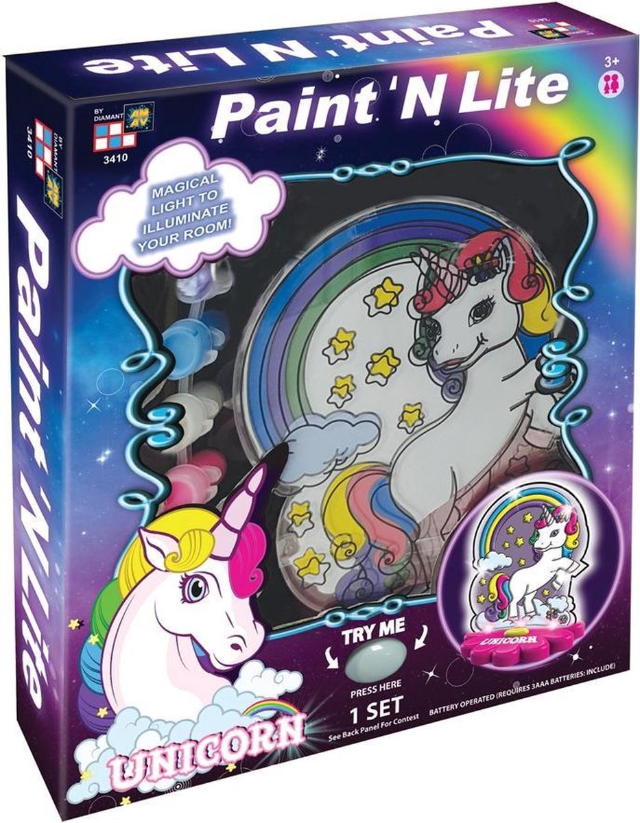 Paint'N Lite hobbydoos eenhoornlamp Schilder en besticker je eigen eenhoornlamp! Maak hem zo mooimogelijk en zet hem dan op je nachtkastje of bureau, want hij werkt echt! Druk op de knop en zie hoe jouw kunsterk licht begint te geven.