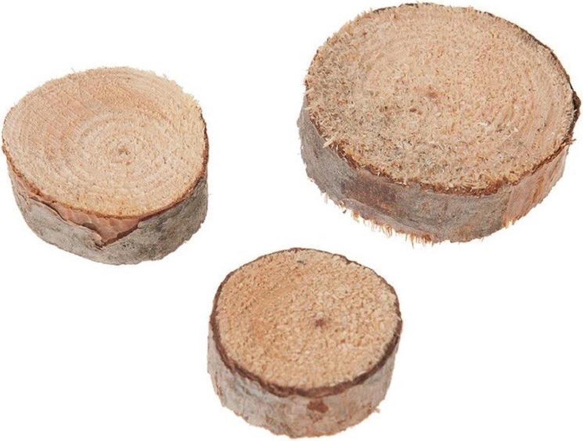 Houten decoratie boomschijfjes diverse formaten 250 gram. Een zak met kleine houten schijfjes in verschillende maten ongeveer 250 gram. Te gebruiken als decoratie materiaal voor knutselen of bijv. tuin, en bloem schikken.