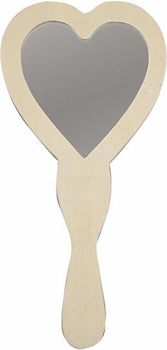 Houten handspiegel hartje. Dit handspiegeltje heeft een vorm van een hartje. Het formaat is ongeveer 24 cm. Materiaal: triplex.