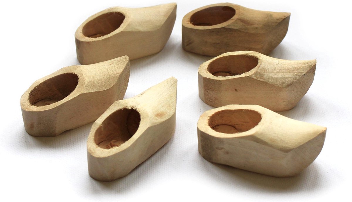 6 Houten Klompjes (large) Materiaal: Onbewerkt vurenhout Lengte 7 cm. Breedte 3 cm. Hoogte 3,5 cm. Leuk voor workshops om ze te beschilderen.