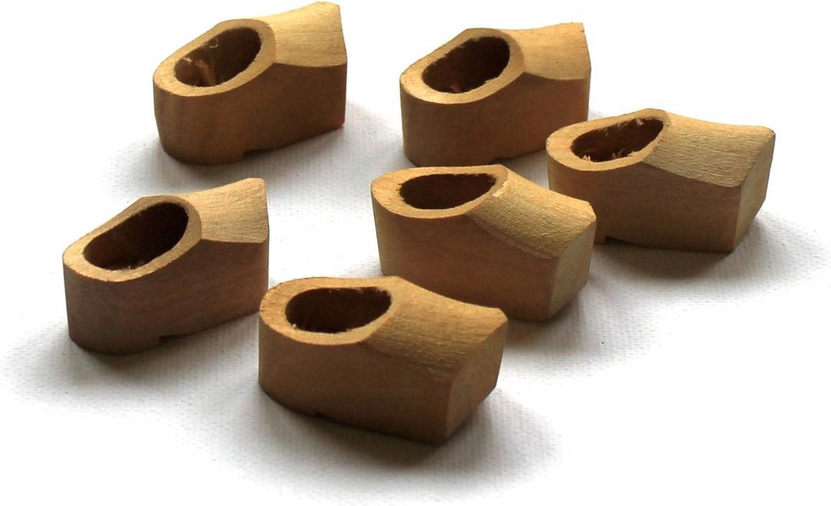 Set van 6 Houten Klompjes (small) Materiaal: Onbewerkt vurenhout Lengte 4 cm. Breedte 2 cm. Hoogte 2 cm. Leuk voor workshops om ze te beschilderen.