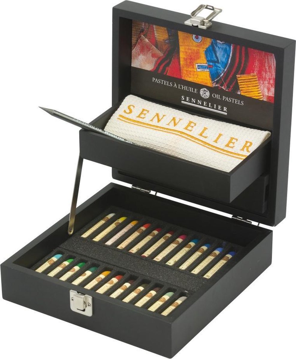 Zwarte houten koffer met 24 oliepastels van het merk Sennelier.